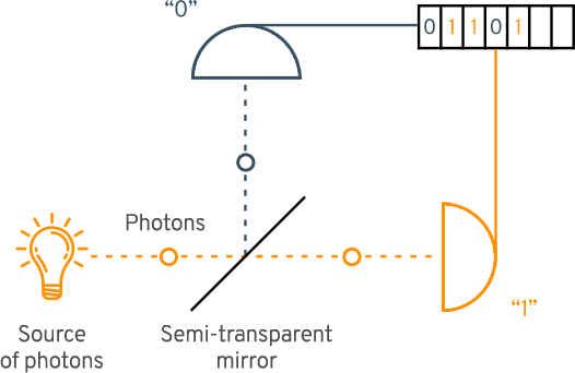 One such situation, which is very well suited to the generation of binary random numbers, is the transmission upon a semi-transparent mirror. The fact that a photon incident on such a component be reflected or transmitted is intrinsically random and cannot be influenced by any external parameters.